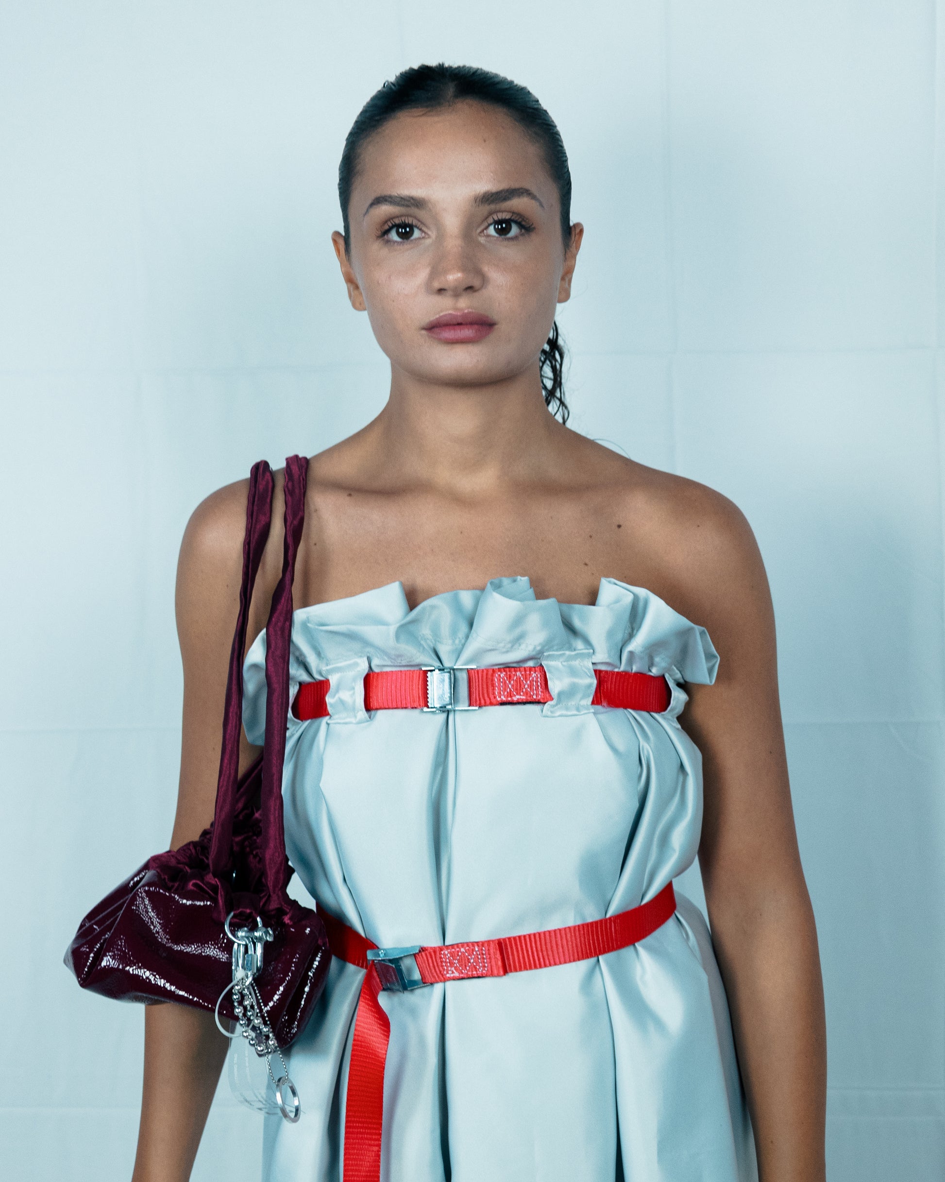 Un abito concettuale e scultoreo che rilegge il classico tubino in chiave contemporanea. Realizzato a partire da un unico pezzo di tessuto cucito a formare una struttura ampia e lineare, il vestito prende vita attraverso un sistema di passanti e cinture di fissaggio. Una prima cinghia rossa, inserita sul bordo superiore, stringe il capo e lo adatta al corpo di chi lo indossa, creando un effetto di drappeggio controllato. Una seconda cintura, posizionata in vita, definisce ulteriormente la silhouette, adattandosi al corpo che lo indossa . Ispirato all’opera monumentale di Christo e al suo “Arco di Trionfo impacchettato”, il design rievoca l’idea di avvolgimento e trasformazione: un corpo che diventa architettura e un tessuto che diventa scultura.