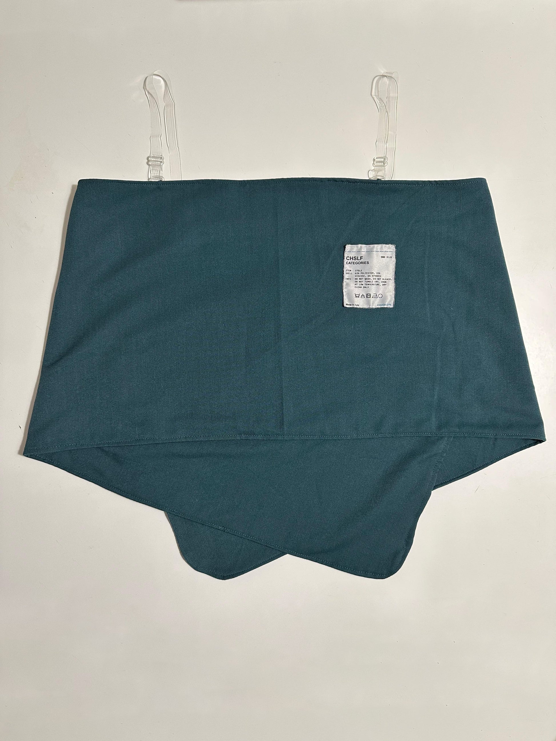 Realizzata in gabardine compatto, questa stola presenta una costruzione sartoriale minimal e contemporanea. La forma a fascia (150 cm x 30 cm), cucita su se stessa, crea una silhouette pulita e strutturata. Due sottili spalline trasparenti la sostengono, garantendo stabilità e comfort senza alterarne l’estetica essenziale.
